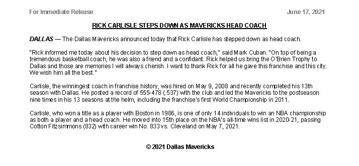 Rick carlisle announced thursday that he is resigning as head coach of the dallas mavericks. Richard preston carlisle (born october 27, 1959) is an american professional basketball coach who is currently head coach of the dallas mavericks, which he has held 2008. Jump to navigation jump to search. Rick carlisle et dallas, c'est terminé. This game today was from another planet.